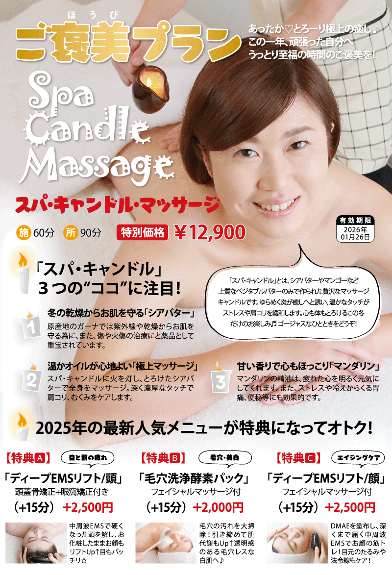 2025年も残すところあと僅か。いよいよ年末お馴染みの大感謝祭「ビッグウィンターセール」のご案内です。急に寒くなってきたこの時期、まず「スパ・キャンドル・マッサージ」でご自身へご褒美はいかがですか? 一年の疲れを癒す“あったかい”期間限定プランです。次に、忘年会・新年会と太りやすいこのシーズン。大人気の「ノーニードル・メソセラピー」が「痩身回数パス」となって限定発売します!タイプに合わせ、サポート・メソッドを駆使して施術プランを作ることができるので、きっと貴女の救世主になってくれるはずです♪。さらに絶対的人気を誇る「CBDリラクゼーション」が、冬の極上アロマとコラボプランで登場! どうぞ疲れた体を癒してください。加えて、年末年始の長期休暇を利用してお肌の徹底改善をお望みなら「ハーブピーリング」がおすすめ! リピーター続出の「エクソソーム・セラピー」と組み合わせれば効果抜群です。最後に恒例「回数パス/ビッグウィンターセール」も同時開催しております。年末は混みあいますので、どうぞお早めにご予約の上ご来店ください。