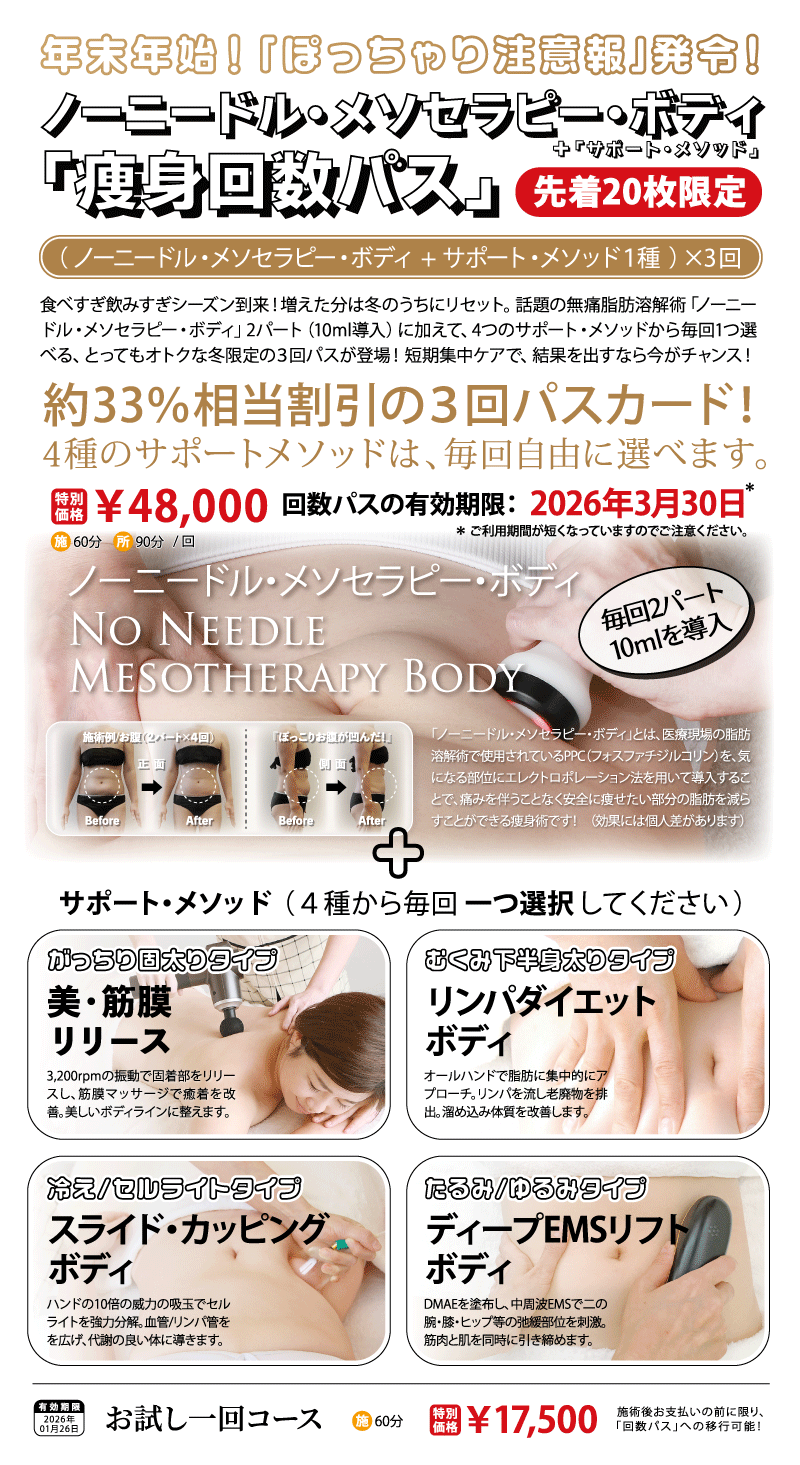 お待たせいたしました!「ノーニードル・メソセラピー・ボディ」の回数パスはないの?と多くのお客様からのご要望にお応えして期間限定の『瘦身回数パス』を発売します。毎回2パート(お腹、背中、二の腕など)10mlの脂肪溶解剤導入に加え、サポート・メソッド4種から自由に選べる結果重視の回数パスです。全3回のお得な回数パスで年末年始の暴飲暴食をなかったコトに!