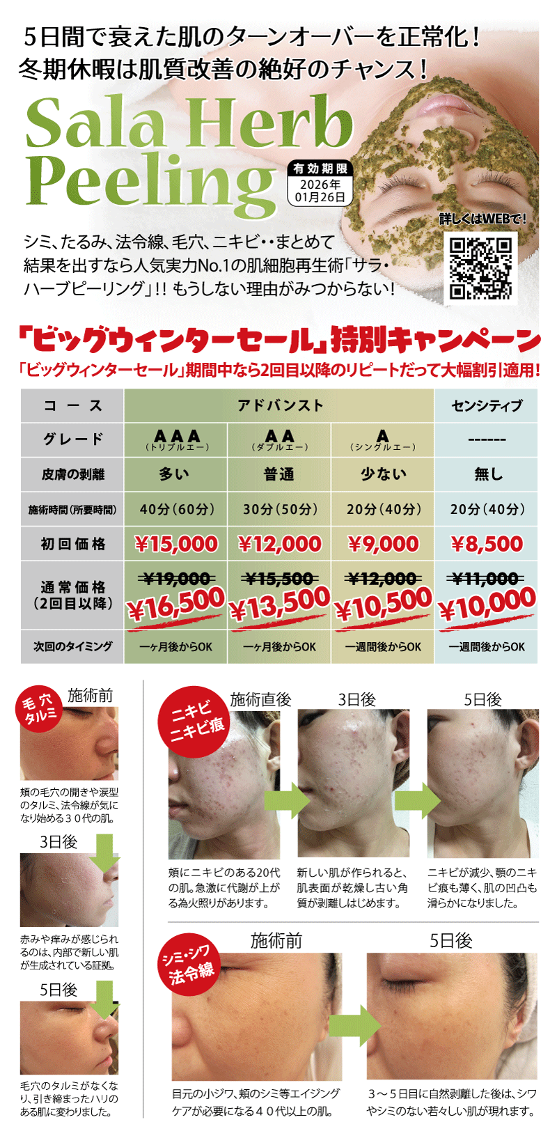 シミ・吹き出物・シワ・ニキビ痕なら実績No.1「細胞から若返る自然剥離型・肌再生術。今回は「ビッグウィンターセール」として、リピーターの方に“とってもオトク”な内容となっています! ぜひ「サラ・ハーブピーリング」をご利用ください!