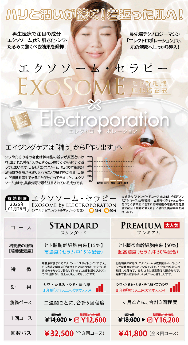 再生医療で注目の成分「エクソソーム」があなたを変える! エイジングケアの常識が覆る驚異のフェイシャルエステ! お蔭様で「プレミアムコース」が大人気! 肌年齢40代以上の方に特にオススメです。我々が自信をもってお届けする究極のソリューションをお試しあれ!