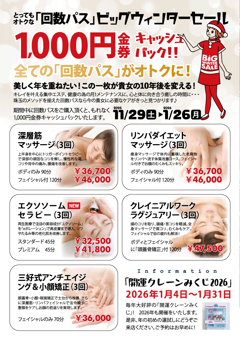 「回数パス・ビッグウィンターセール」回数パス1,000円金券キャッシュバック!