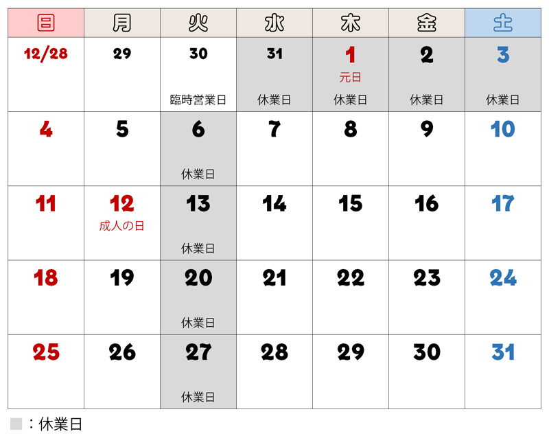 平素より格別のご愛顧を賜り、誠にありがとうございます。当店では年末年始に伴い、2025年12月および2026年1月の営業日程が通常とは異なる体制となります。