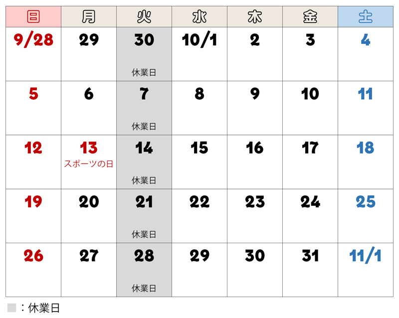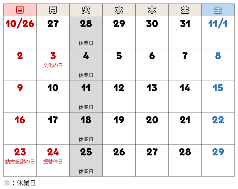 2025年10月・11月は通常通りの営業(火曜日が定休)となります。 詳しくは下記のカレンダーをご参照ください。